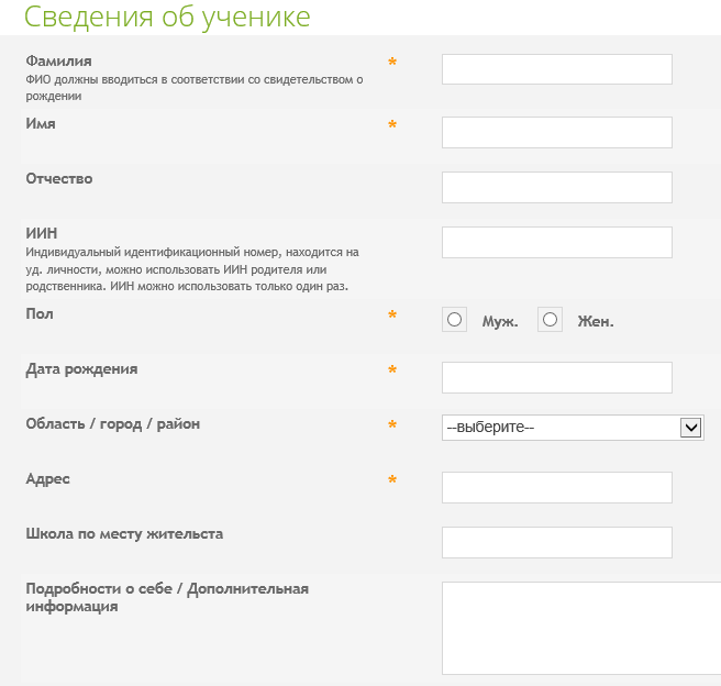 ИИН - При заполнении формы регистрации необходимо указать ИИН регистрируемого ученика, если такого не имеется, то ИИН законного представителя. Как и Ф.И.О. поможет системе идентифицировать Вас в спорных вопросах а также при восстановлении пароля.